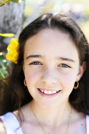 A close-up portrait of a pretty, smiling, dark haired young girl outdoors.