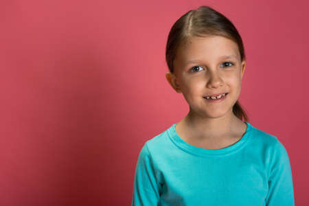 Little Beautiful Baby Girl Pink Background Bright Clothes Turquoise Blue Shirt Looks Into The Camera