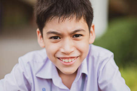 Portrait of smart elementary student laughing with diverse friend at school. Close up of attractive children smiling while wearing uniform cloth with blurring background. Education concept. AIG42.