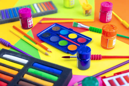 Colorful art workplace, watercolor and crayon pastel chalks on yellow, orange, red, close up