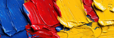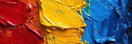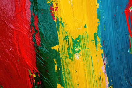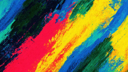 Bright primary colors overlap in an energetic display of abstract brushstrokes, showcasing a blend of hues that evoke a sense of movement and creativity.