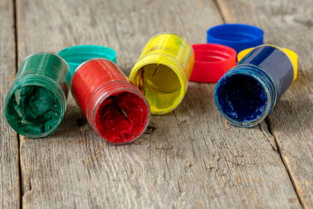 The tilted jars with dry gouache on wooden background