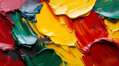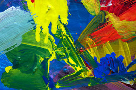 Bright red, yellow, and green paint strokes create a vibrant composition on a light background, showing artistic expression and creativity.