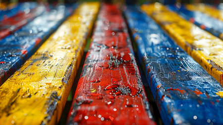 Colorful wooden bench with water drops on it. Selective focus.