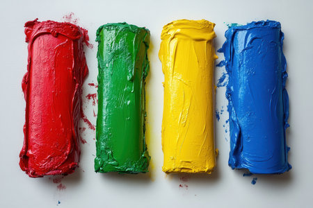 Four tubes of paint rest side by side, featuring bright red, green, yellow, and blue colors. Each tube appears freshly squeezed, showing a smooth, textured surface against a clean white backdrop, inviting artistic creativity.