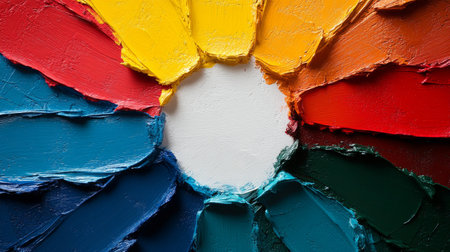 Close-up of vibrant, textured oil paint strokes arranged in a circular pattern with bright red, yellow, blue, and green hues on canvas.