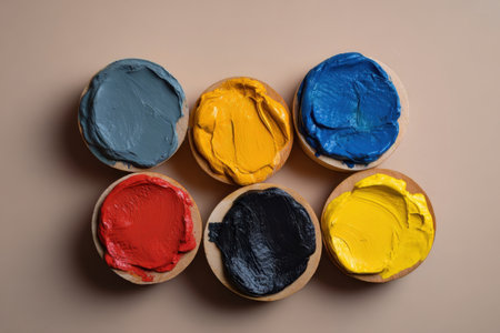 Bright paints in various colors sit in wooden containers on a soft beige background. Artists often use these hues to create vibrant artworks and express creativity.