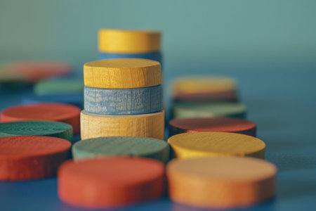Vibrant wooden block tower on blue table with matching background for creativity and imagination concept