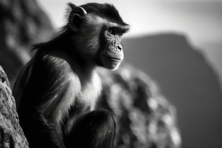 A solitary monkey sits thoughtfully on a rock, surrounded by a soft, misty environment. The image captures the serene moment, showcasing the beauty of wildlife.