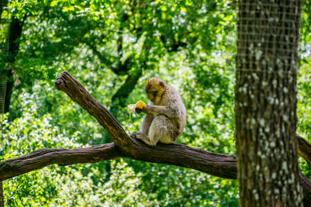 Cute baby monkey. Funny baby of Barbary macaque with open mouth on beautiful forest background