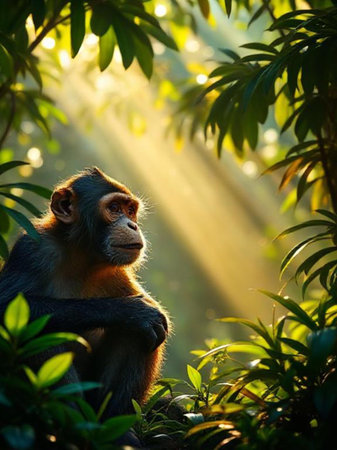 An AI generated illustration of an adorable monkey perched on a tree branch in a lush green forest