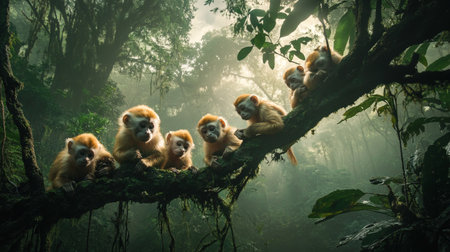 A monkey sits amidst vibrant green foliage in a lush rainforest
