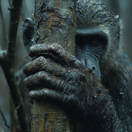 Wet baboon clinging to tree, rainforest background; wildlife documentary