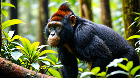 Curious chimpanzee exploring lush jungle foliage in natural habitat.