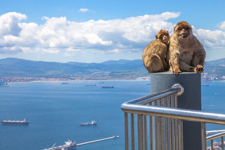 The famous wild macaques of Upper Rock Natural Reserve in Gibraltar Rock. Gibraltar is a British colony that is located at southern end of Iberian Peninsula.