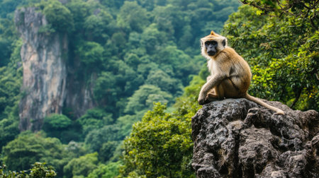 This stunning image features a curious monkey perched on a rocky outcrop, surrounded by a vibrant green forest. The scene beautifully captures the essence of wildlife in a tranquil, natural setting.