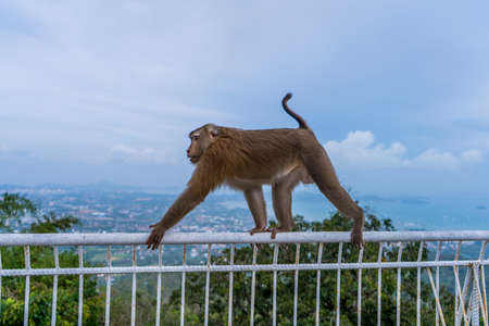 Wild monkey at the top of mountain Batur in Bali island during the sunrise