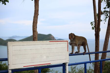 Monkey sitting on the wall, Thailand. ( Filtered image processed vintage effect. )