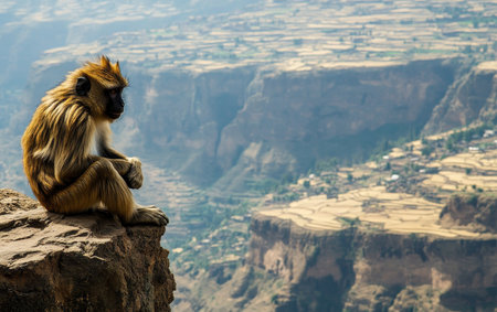 A gelada baboon sits perched on a rocky outcrop, surveying a vast mountainous landscape with deep valleys and terraced fields stretching to the horizon.