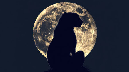 A striking silhouette of a bear sitting peacefully against the backdrop of a bright full moon, embodying the beauty of the night sky and nature.