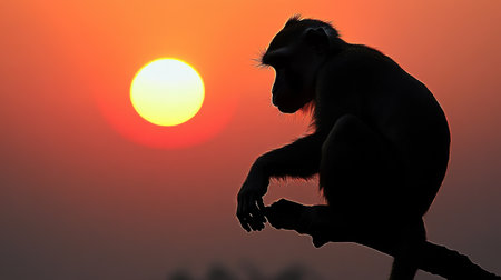 A majestic monkey can be seen in silhouette as it sits gracefully on a branch, framed by a stunning sunset that fills the sky with rich hues of orange and red.