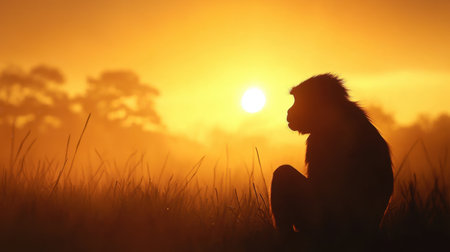 A striking silhouette of a monkey sitting in grass against a vibrant orange sunset, capturing the serene beauty of nature and wildlife.