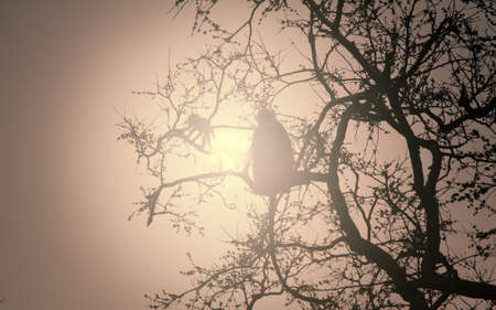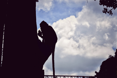 Black and white monkey silhouette sitting in the middle of the jungles