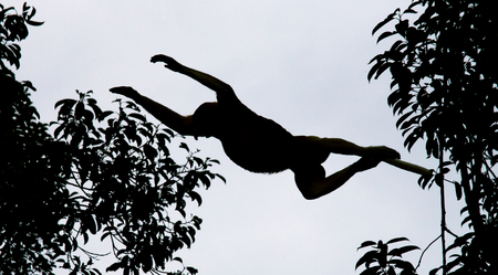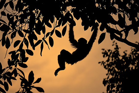 Silhouette of a hanging monkey in the jungle at sunset.