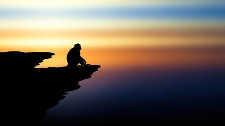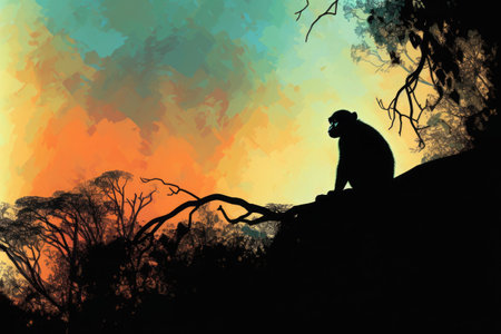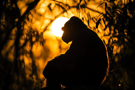 Silhouette of a monkey sitting on a rock during a vibrant sunset, capturing the essence of wildlife and nature in a serene and peaceful environment