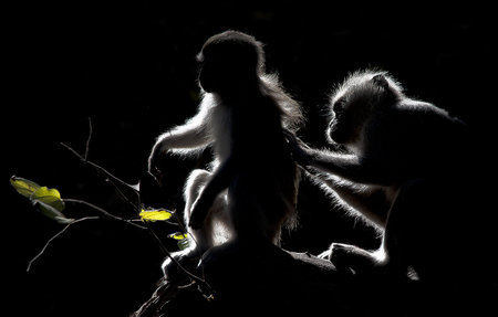 Silhouette of a pair of Vervet monkeys on a tree at night