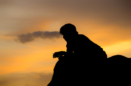 Silhouette of a man sitting on the edge of a cliff