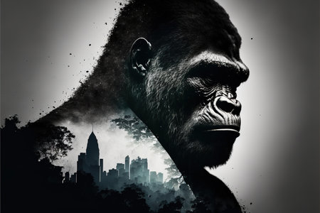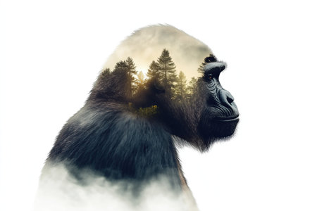 Double exposure of a gorilla merged with a misty forest, symbolizing strength and nature