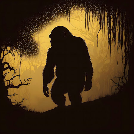 A large ape silhouette stands in a dark, mysterious forest. The scene evokes feelings of mystery and suspense.