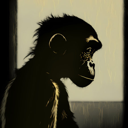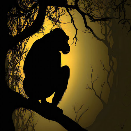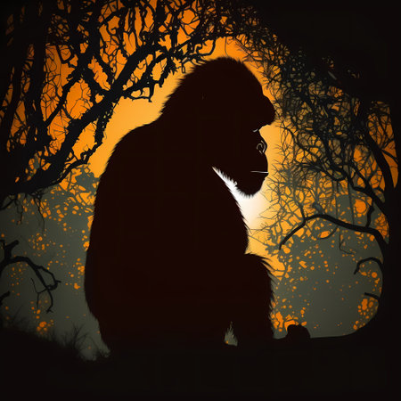 AI Generated. Silhouetted Primate Gazing Upwards In Darkness