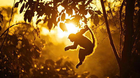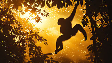 Silhouetted monkeys swinging on tree branches with sunlight streaming through lush green jungle foliage, creating a serene and natural scene.