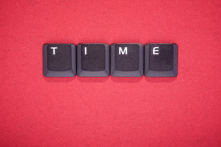 the concept of time. hand men in business suit holding the cubes which the written word time
