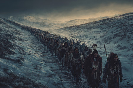 Trail of Tears - line of Native Americans walking through harsh terrain in cold desolate landscape.