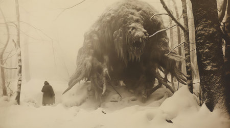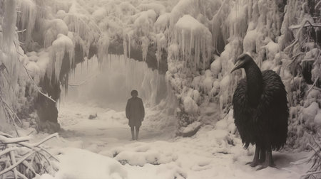 the colossal duck monster, frozen in time, stands amidst the ancient ruins, its icy fur glistening in the faint light, as it fixes a piercing gaze upon the brave explorers, its frosty presence exuding an aura of mystique and foreboding, evoking a sense of wonder and trepidation in this surreal, snow-covered landscape. ai generated