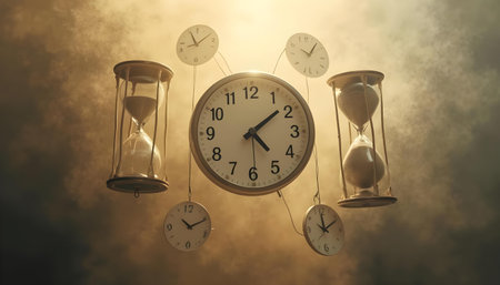 Old-fashioned clocks with Roman numerals show various times, creating a sense of timelessness and nostalgia.