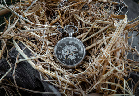 A retro pocket watch on straw background. Hope and Value of time concept, Selective focus.