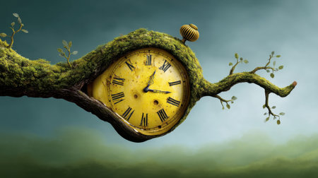 This enchanting image depicts a vibrant yellow clock nestled within a moss-covered branch, surrounded by delicate leaves, evoking a sense of surreal calm and timelessness.
