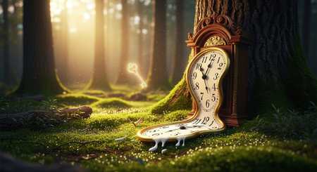 In a mystical forest, a giant clock rests on a road, surrounded by dark green and orange trees. The atmosphere evokes wonder and tranquility, blending nature and the concept of time beautifully.
