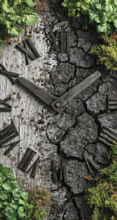 This image features a detailed clock face design integrated with cracked earth textures and lush green foliage. The composition showcases a vintage aesthetic with Roman numerals, weathered wood, and natural elements. Suitable for conceptual projects emphasizing time, nature, and the passage of moments, it has potential for various commercial applications.