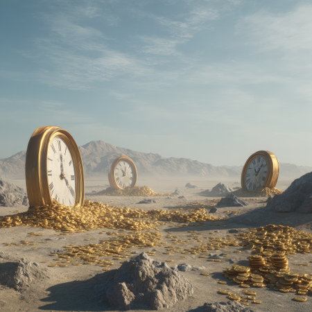 This image presents a surreal landscape featuring large golden clocks partially buried in a field of gold coins. The scene is illuminated by soft light and features a muted color palette with a slightly hazy atmosphere. The composition includes mountains in the background. Suitable for conceptual illustrations or commercial projects.