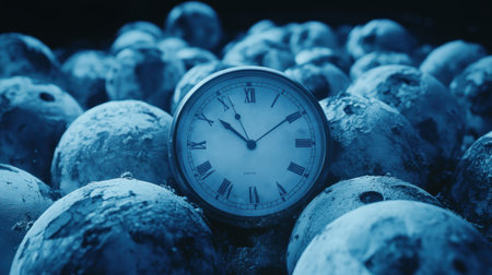 A vintage clock rests among weathered, round objects, enveloped in soft blue light. This imaginative still life captures the essence of time and tranquility.