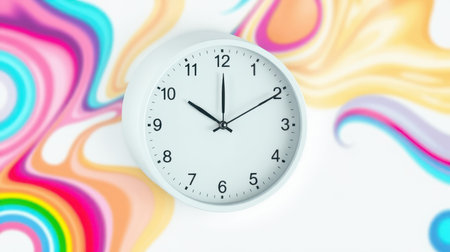 Wall clock displaying time on colorful abstract background during daylight in a bright interior