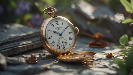 A classic pocket watch placed on top of a rocky surface, symbolizing enduring strength and reliability, A bond that withstands time and challenges