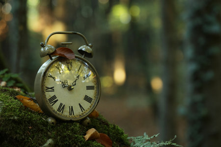 Image of spring Time Change. Summer back concept. Vintage alarm Clock outdoors