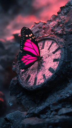 A striking butterfly with pink and black wings rests delicately on a weathered clock face, blending nature and time in an enchanting setting that captivates the imagination.