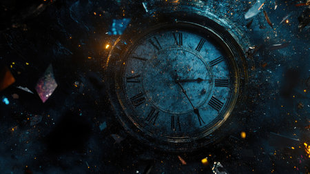 A captivating clock floats in a cosmic backdrop, enveloped by shards of light and dark materials, evoking themes of time and space in a surreal manner.